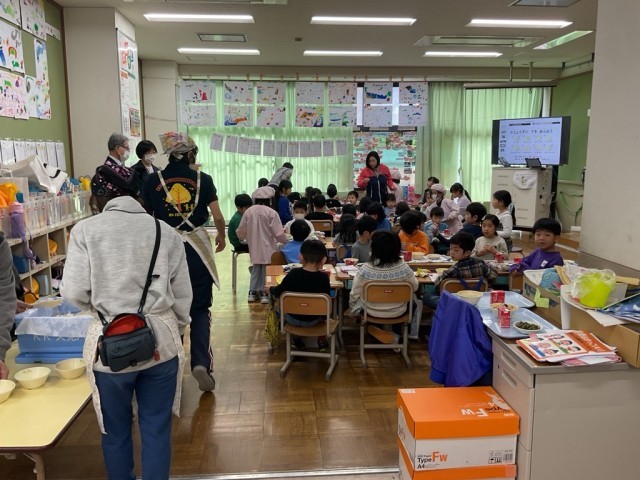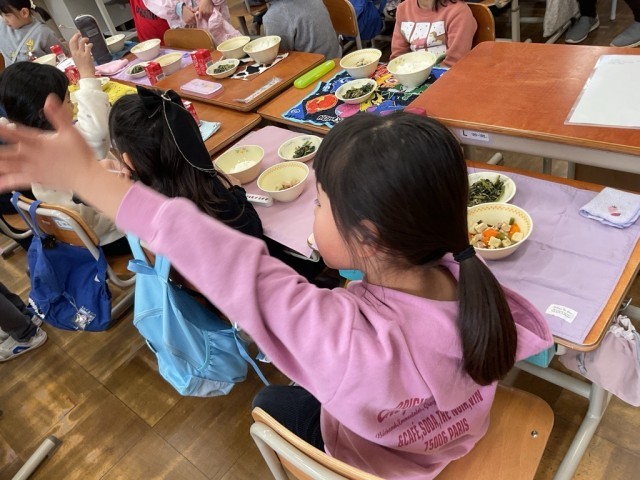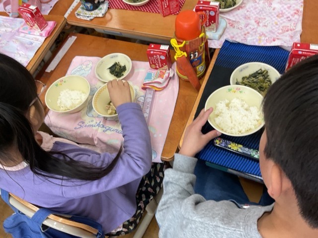 1年生は「給食カレンダーの通りに並べるんだよ。」「食べられる?おへらしもできるよ。」とやさしく声をかけていました。