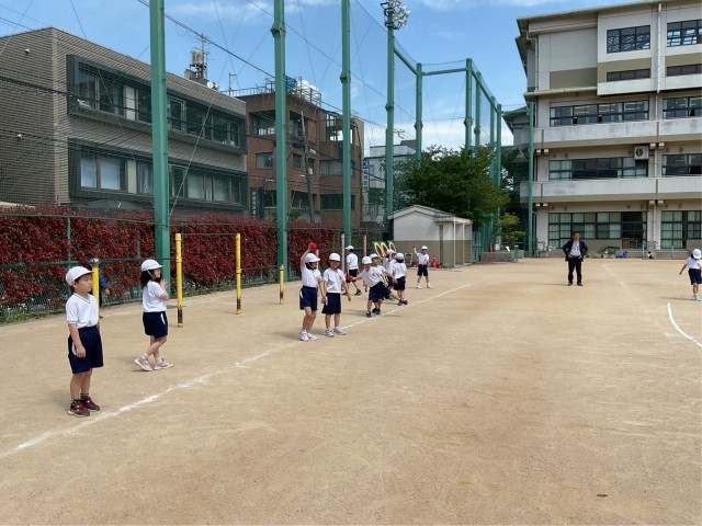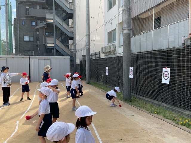 ボールを遠くに投げたり、狙ったところに投げたりと、様々な投げ方に親しんでいます。はじめはうまく投げられなかった子どもたちも、友だちと声をかけ合いながら繰り返し練習する中で、少しずつコツをつかみ、遠くまで投げられるようになってきました。また、「どうしたらもっと遠くまでとぶかな。」「狙ったところにあてるにはどうしたらいいかな。」と考えながら、楽しんで活動する姿が見られました。