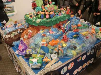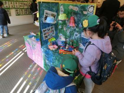 20日,3組の子どもたちと一緒に,堀川御池ギャラリーで開催された「小さな巨匠展」を参観しました。支部ごとに,育成学級の子供たちが取り組んだ絵画や書道,そして幸作の作品が一堂に展示されています。どの作品も,おもいを込めたすてきな作品です。そして,一番感心したのが,みんなで力を合わせた共同制作です。御所東小のみんなは,「オリンピック・パラリンピック大会」を想像して作成。生き生きした作品に仕上がっていましたよ。