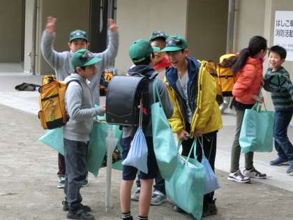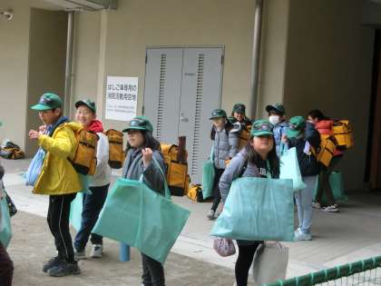 学年ごとの色とりどりの作品バックをかついで持ち帰りました。おうちの方で,じっくりがんばった作品などを見てあげてくださいね。
