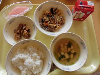 また,「三色ゼリー」がデザートにつきました。このゼリーは,1年に1度しか出ないので,子どもたちはとても大喜びでした。赤・白・緑の三色ゼリーを,「これは,何味かな。」「ゆっくり食べよう。」など話しながら,とてもおいしそうに食べていました。