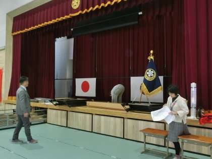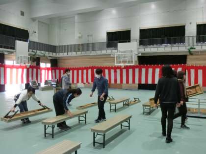 国旗や市旗の準備,校旗の設置,椅子の準備などに加えて,卒業生が通る花道の設えもしました。掃除もみんなでいましたよ。