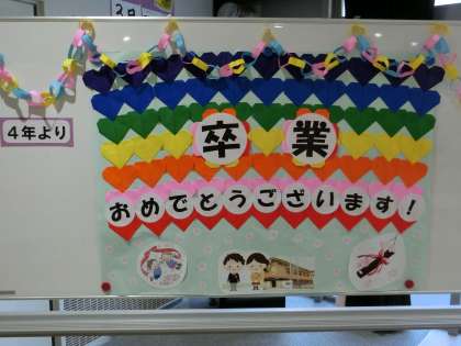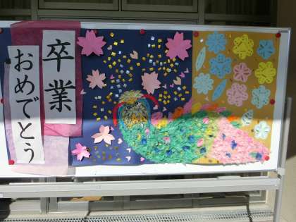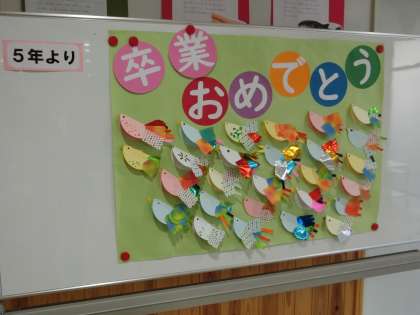 高学年作成の「おめでとう」掲示です。教職員も心を込めて作りました。
