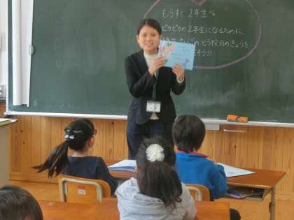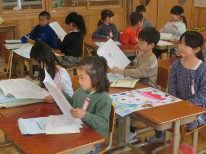 通知票を受け取って,真剣な様子で中を見ている子どもたちも。