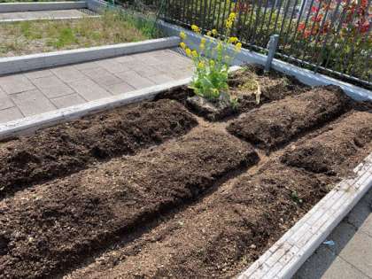 学校園の様子(3年) 公開日 2020/04/27 更新日 2020/04/27 3年生 学習課題プリントの中に,春の生き物をさがすプリントがありましたね。教科書から見つけたり,インターネットで調べたりできましたか。 3年生では4つの植物を育てようとしています。今日の朝学校園で,土を耕して種まきをしました。お花が咲いているのは,はくさいです。チョウのたまごはついているかな。先生たちも観察中です。