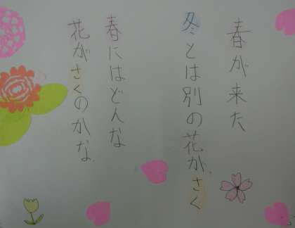 季節の言葉(5年) 公開日 2020/05/01 更新日 2020/05/01 5年生 5年生のみなさんが作った春を題材にした素敵な短歌が先生たちのもとに届き始めているので,紹介したいと思います。五・七・五・七・七の短い字数の中に,春らしさがぎゅっと詰め込まれた素敵な作品がたくさんあり,読んでいてとてもすがすがしい気持ちになりました。こんな時だからこそ,ふだんはなかなか見つけられない春のよさをたくさん見つけられるといいですね!