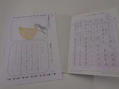 家庭学習の中には,新しい漢字練習ノートが入っています。学習を始める前に,自分で表紙に名前を書きましょう。そして,ノートに書く漢字は,右ページのお手本を見ながら書きましょう。高原先生はこのお手本を書くのに20分かかりました。丁寧な字を書くコツは,お手本をよく見て,ゆっくり書くことです。いくつ花丸がもらえるかな?