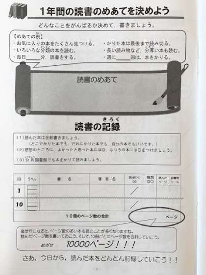 2ページに,「一年間の読書のめあてを決めよう」とあります。めあての例を参考にしてもいいので,この期間を有効に使うためにも,具体的な目標を立て,読書にすすんで取り組んでほしいと思います。
