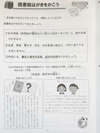 また,24ページには,「読書絵はがきをかこう」とあります。書き方や,高学年向けの作品例などが載っているので,取り組んでみましょう。