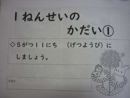 5がつ11にち(げつ)のかだい(1ねんせい) 公開日 2020/05/08 更新日 2020/05/08 1年生 1ねんせいの みなさん。げんき ですか。 きょうは,とても いい おてんき でしたね。 11にち(げつ)〜15にち(きん)の かだいを とどけに いきました。 これから ほうむいぺえじで やりかたを しょうかい していきます。 がんばってね!