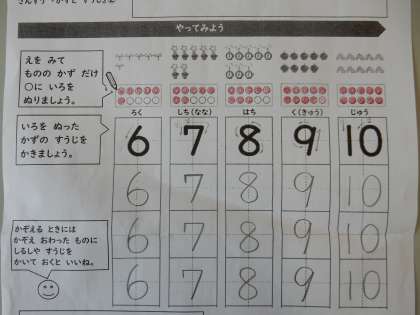 かぞえ おわったら,つぎは 6〜10のすうじを かいてみましょう。