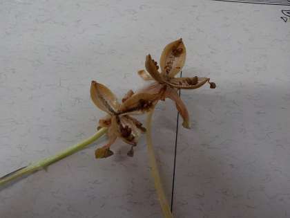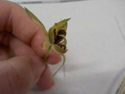 さらに色が茶色く変わっていくと,2枚目の写真のように開いています。開くときにパンっとはじけて中の種が広い範囲に飛び散るようです。飛び散った種は,また新たな芽を出すのかな・・・?