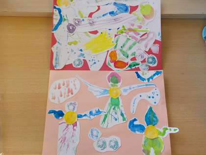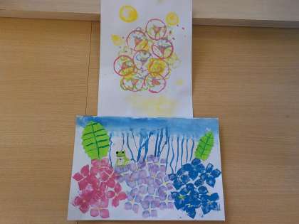 前に紹介していた表し方以外にも,手形をスタンプしていたり,自由に表現したものを張り合わせて1つの作品にしたり,絵をかき足してみたり・・・。それぞれに工夫が見られてとても楽しい作品ですね!見ている先生たちも元気が出ます。