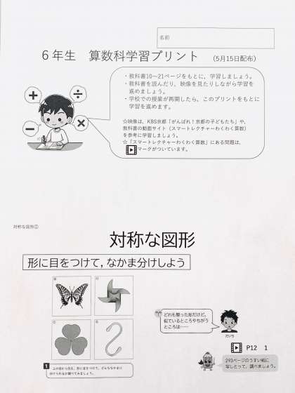 さて,算数の課題が,新しく6年生の教科書の内容に入りました。教科書だけではなく,動画で教えてくれるウェブサイトがあるので紹介します。インターネットで,「スマートレクチャー わくわく算数」と検索すると出てきます。6年生の「対称な図形」を選択すると,課題の理解を助ける動画があります。