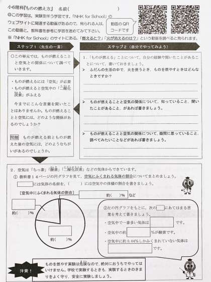 また,理科「ものの燃え方」の学習では,プリントの上の部分に,実験の様子が見られる動画について説明しています。スマートフォンなどで読み取れるQRコードも張り付けてあります。