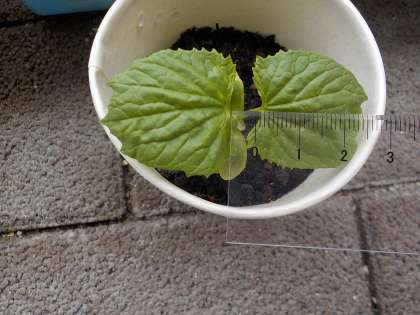 5月15日(金)のツルレイシの様子2(4年) 公開日 2020/05/18 更新日 2020/05/18 4年生 もう少しくわしく見てみましょう。上から見た葉の様子です。葉の大きさは約2.5cmです。高さは3cmくらいありました。 他にも,ぽこぽこと芽が出始めているので,早くみんなと観察したいです。