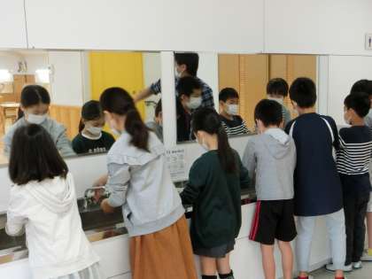 教室に入り,健康観察をした後は,正しい手洗いの仕方をみんなで確かめました。