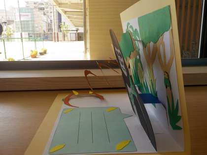 ちなみに,カードを横から見てみると,このような飛び出す仕組みが仕掛けられています。教科書のP40〜41に作り方がのっています。(教科書のコピーも渡しています。)参考にしながらチャレンジしてみてくださいね!