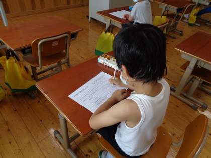 お道具箱の中身を確認し,家庭学習の振り返りをした後は,運動場に出て,鬼ごっこやケンパをしました。蒸し暑い一日だったので,子どもたちは「こんなに汗をかいたのは久しぶり」と口をそろえて話していました。手洗い・うがい・消毒のあとは,しっかりと水分補給をしました。