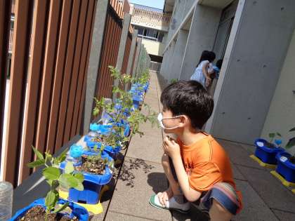 前回,屋上の畑で植木鉢に土を増やす作業をしました。屋上に置いていた植木鉢を自分たちの教室により近い場所に引っ越ししました。じっくりと野菜が観察できるので,子どもたちも喜んでいました。お水もしっかりとあげて,野菜の成長を観察していきましょう。