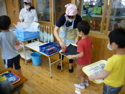 きれいに手を洗って,うがい,消毒,トレイの準備が終わると