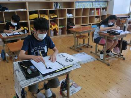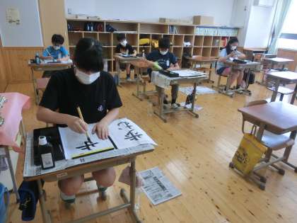 今学期初めての習字です。「歩む」という字を書きました。画数は多くないので簡単そうに思うのですが,字形を整えることが少し難しかったようです。気持ちを引き締めて,集中して一筆一筆丁寧に書いていました。