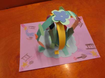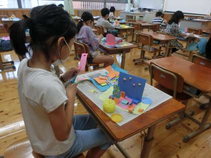 回る仕組みを使って,作品づくりです。ハサミを巧みに動かしていろいろな形に切り,それらを組み合わせて作っていきます。頭の中には完成した作品のイメージがあるのでしょう。もうすぐ完成のようです。