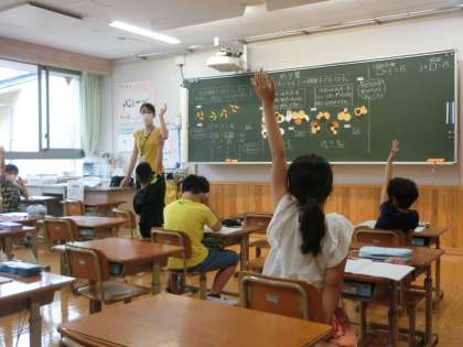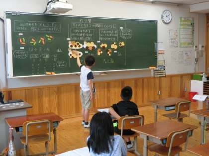 算数でわり算の学習をしています。同じ式になる2つの問題を比べて,気付いたことや分かったことを,黒板の前に出て,絵を指しながら説明していました。どう言えば聞いている人に分かってもらえるかな,と考えながら一生懸命に話す姿が見られました。