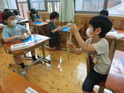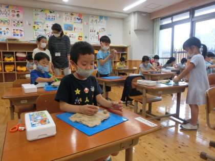 授業の様子1 (1年) 公開日 2020/06/12 更新日 2020/06/12 1年生 1年生の教室では,図画工作の学習で,粘土をしていました。小さくちぎって丸めたり,手のひらで丸いお皿のような形を作ったり,粘土をこねこねしているといろいろな形ができてきます。「ねえねえ,見て。両手でころころ転がしていたら,こんなに長いのができたよ。」と,友達に見せている子もいました。粘土となかよしになって,楽しく活動できました。
