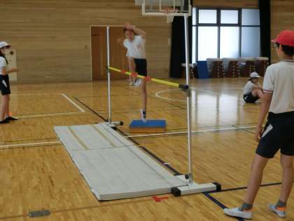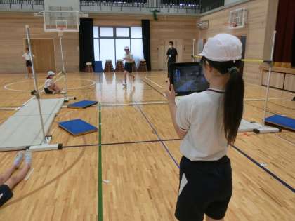 高跳びに挑戦です。一人一人が目標を設定して,チャレンジしています。タブレットで跳ぶ姿を記録してもらい,後でフォームや助走の仕方などをチェックして改善できるところは改善して次の跳躍に活かしていました。記録が伸びてガッツポーズしている姿が見られました。