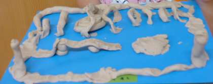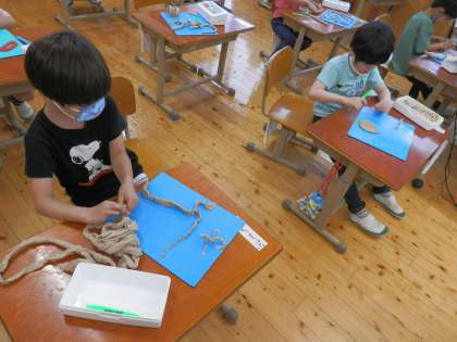 最後は,粘土のひもを使って好きなものを作りました。「せっかく長くしたひもなのに」と残念そうにしている子もいましたが,頑張ったものを使って新しいものを作る楽しさを感じている子もいました。ひもで蛇を作ったり,公園を作ったりと,すてきな作品を作ることができました。