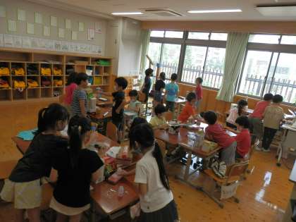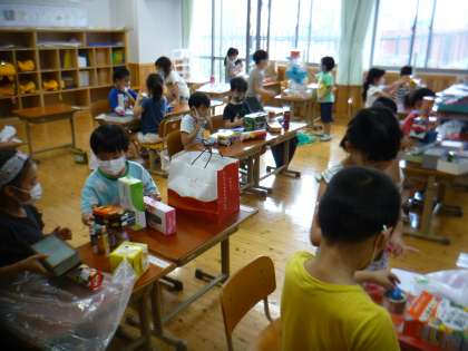 お家から,持ってきた箱や缶などを使って,形の学習を始めました。いろんな形があることにみんな大興奮。ペアや班に分かれて,いろんな形を使い,好きな物をつくりました。今自分たちが持っているもので,「何を作ろうかな」とお友達と相談しました。