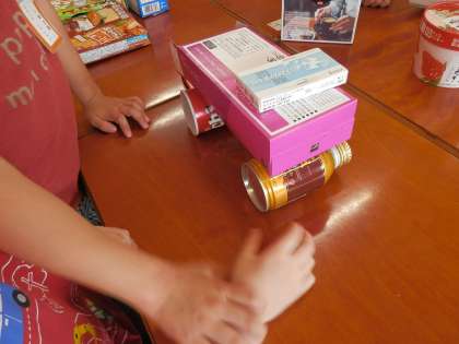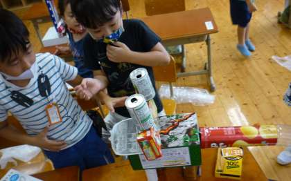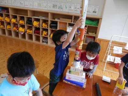 どんなものが出来上がったのかなと見てみると,箱を高く積み上げてタワーにしているところや丸いものをタイヤにして,車を作っているところ,円柱を足にして動物を作っているところなどお友達と協力して,活動することができました。いろいろな形から,出来るものを想像し,作りました。