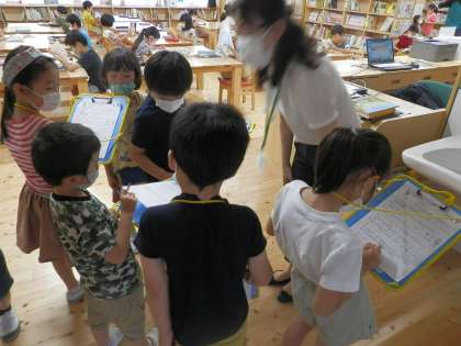 「先生のお名前を教えてください。」「先生のおすすめの本はなんですか。」「本は何冊あるのですか。」などを質問していました。聞いたことをしっかりメモすることができていまいした。質問が終わったあとに絵本を読んでくださって,みんな大喜び。今回は,「いちにち なぞの いきもの」や今,1年生は国語で「くちばし」の学習をしているのでくちばしの図鑑を紹介してもらっていました。
