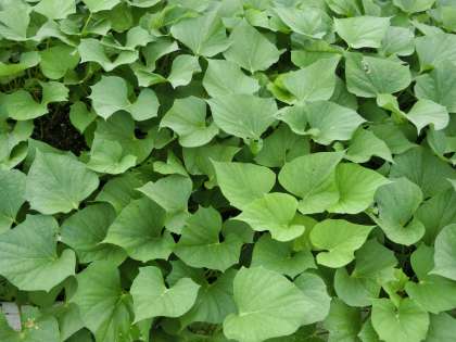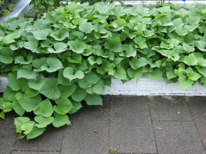 これは,3組の花壇の「サツマイモ」です。3組の子どもたちは,毎朝,水やりを欠かさずにしています。梅雨の時期のお助けもあって,ぐんぐん大きくなってきています。