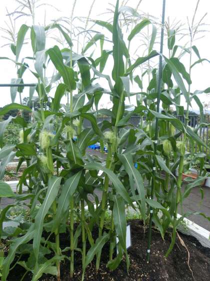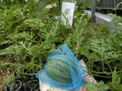 2年生の花壇の「トウモロコシ」と「スイカ」が大きくなってきました。トウモロコシは,子どもたちの背よりも高くなっています。ひげが生えてきて,実もついてきているようです。スイカは,ソフトボールくらいまで育ちました。もうすぐ収穫です。