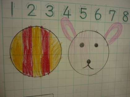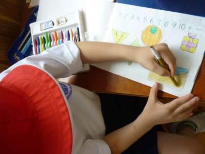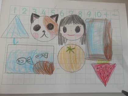 ノートに書いた形から,どんな絵が出来るのかを想像して色を塗りました。四角の形からは家や電車などを,三角の形からは富士山や傘などを,丸の形からはボールや人をかいていました。形から,絵ができていくことが楽しかったみたいです。次は,身の回りにどんな形があるかを調べてみるといいですね。
