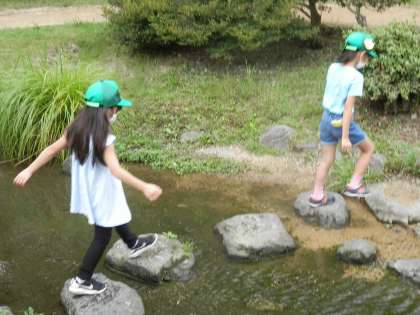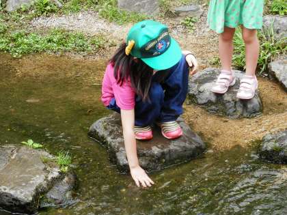 出水の小川では,流れている水を触って「気持ちいい!」と言っていました。暑いので,冷たい川のお水が心地よかったようです。落ちている葉っぱを川に流して,どこまで流れていくかを楽しんでいる子もいまいした。