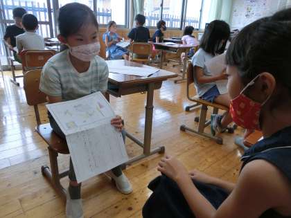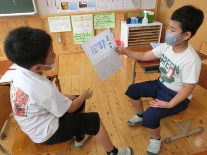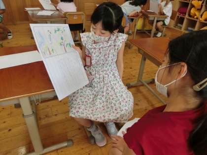 夏休みに,絵日記の宿題を出しました。その絵日記をもとにしながら夏休みの思い出を友達に伝えました。話す人は,絵を指で押さえながら詳しく説明し,聞く人は,質問や感想を伝えていました。それぞれが心に残った思い出を楽しそうに話し合っていたのが印象的でした。夏休み明けからも「えがお いっぱい」を大切にしていきましょう。