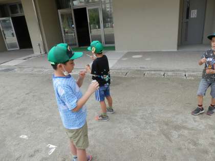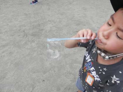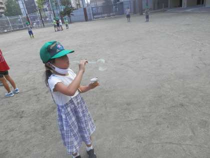 今日は,生活の学習でしゃぼん玉をしました。広い運動場で,「どこまで飛んでいくのかな。」「大きなしゃぼん玉を作りたいな。」とつぶやきながら,楽しみました。ゆっくり吹くと大きなしゃぼん玉,勢いよく吹くと小さなしゃぼん玉が何個も出るようで,その違いに気付きお友達に教えて,1年生全員で楽しむことができました。