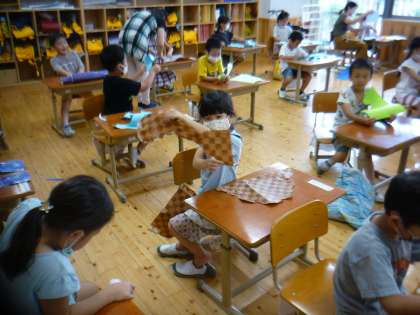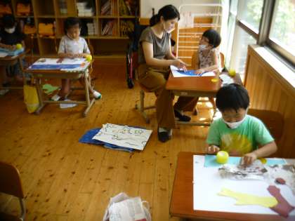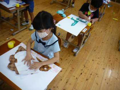 包装紙や画用紙をやぶって,どんなものになるのかを考えて大きな画用紙に貼りました。最初は,「何の形にも見えないよ。」と言っていましたが,どんどんやぶっていくと形に見えてきたみたいです。「ロケットみたいだよ。」「キツネみたいだよ。」といろいろな形に見えることを楽しんでいました。明日は,白い画用紙に模様をつけたり,絵をかいたりします。どんな完成になるのか楽しみです。
