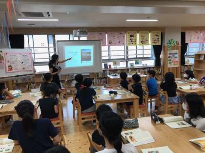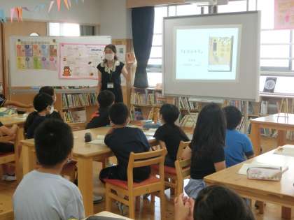 5年生の国語科は,「作家で広げるわたしたちの読書」の学習に入りました。みんなで重松清さんの「カレーライス」を読んだ後に,学校司書の川原先生に重松清さんの作品のブックトークをしていただきました。