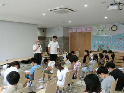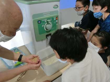お米屋さんにインタビューしよう1(5年) 公開日 2020/09/08 更新日 2020/09/08 5年生 学校の近くのお米屋さん「深尾米穀」の方に来ていただき,お米作りについてのお話を聞きました。 お米ができるまでの様子や昔とのお米作りの違いを教えていただいた後,精米機で実際にお米が精米される様子を見せていただきました。 玄米があっという間に白米に変わるのを見て,子どもたちは驚いた様子でした。