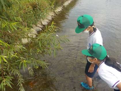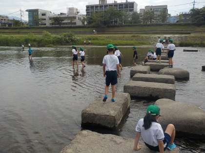 鴨川では,実際に川に入って水の冷たさや流れの速さを感じたり,生き物を見つけたりしていました。