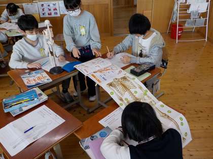 わたしたちの体と運動(4年) 公開日 2020/11/27 更新日 2020/11/27 4年生 理科の学習で,体全体の骨と筋肉が,どのようなつくりや仕組みになっているのかを模型や本を使って調べました。グループで協力して調べることで,人の体には頭から足の先まで全身に骨や筋肉があり,関節で体を曲げていろいろな動きをできることが分かりました。