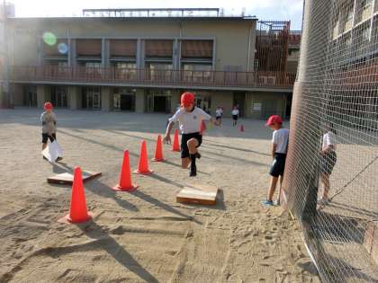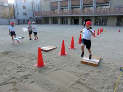 走り幅跳び(5年) 公開日 2020/11/30 更新日 2020/11/30 5年生 体育の時間に,走り幅跳びの学習をしています。2グループで係を交代して練習をしています。助走や踏み切り,空中動作など,より遠くへ跳ぶための工夫をして自分の記録に挑戦しています。