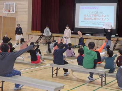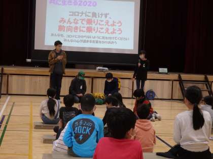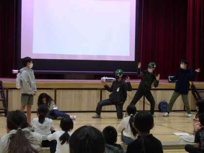 開会式のグループは,「みんなで前向きに乗り越えよう」というメッセージがこめられた劇やクイズをしました。見に来てくれた子どもたちを巻き込んで,とても楽しそうに,元気よく発表することができました。