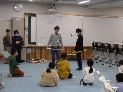 ソーシャルディスタンスについてのクイズを行う場所と,フラフープを使って相手との間隔を取りながら,3つの目的地へ辿り着こうという活動を並行して行いました。