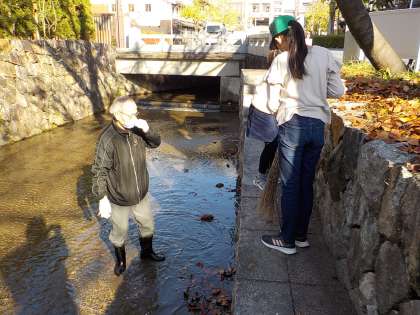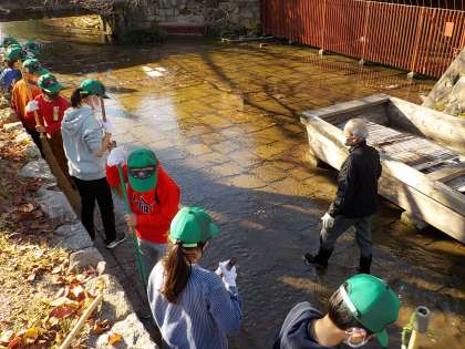 保勝会の皆さんと協力しながら,高瀬川の清掃をする子どもたち。ゴミを軍手でつかんで集めたり,落ち葉をはいて植込みに集めたり・・・普段の保勝会の皆さんがされている掃除の仕方を教えていただきながら,みんなで力を合わせて清掃をしました。