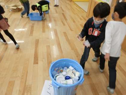 生活科では,新しい学習が始まりました。ご家庭にお願いしていたキャップ,箱,カップ,筒などの材料が集まりました。色々なものがあることから,「種類や形ごとに分けたい」という子どもたちの声が出てきたので分類することにしました。その後,分類した材料をどうしていきたいのかを聞くと,「これらを使って遊びたい」「何かを作ってみたい」などの思いが出ました。